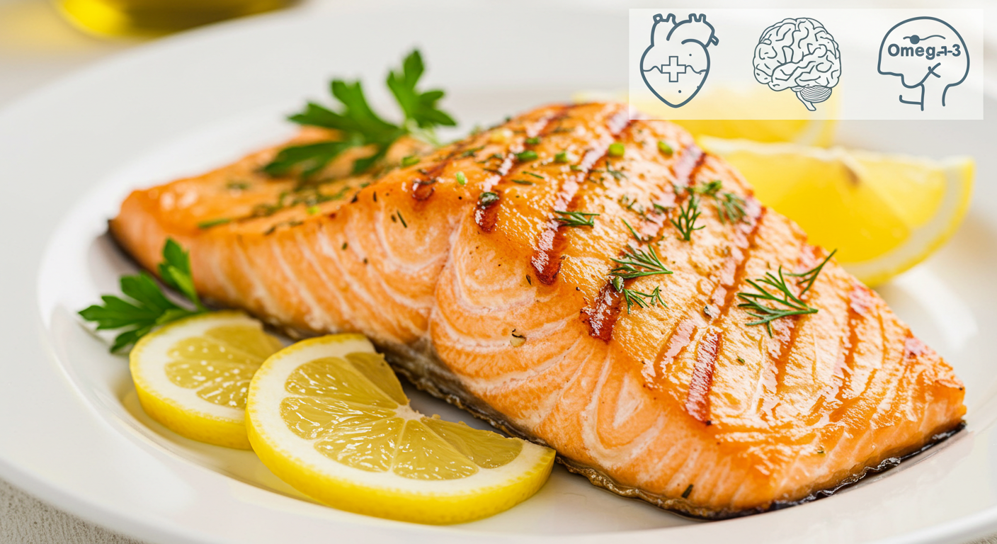 연어 요리와 함께 오메가-3가 뇌와 심장 건강에 미치는 영향을 시각화한 이미지