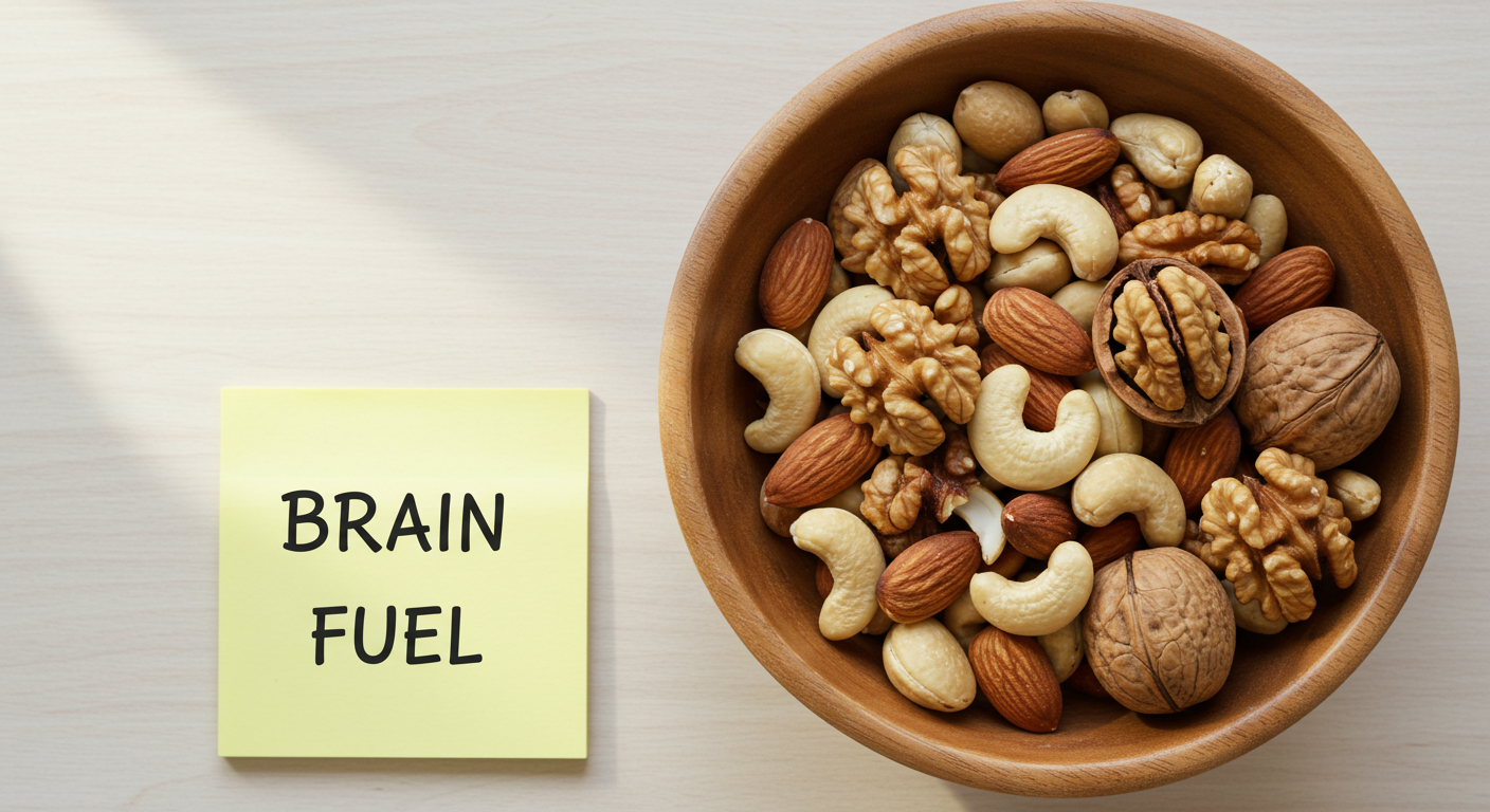 견과류가 뇌의 에너지원이라는 메시지를 담은 실물 느낌의 고화질 이미지