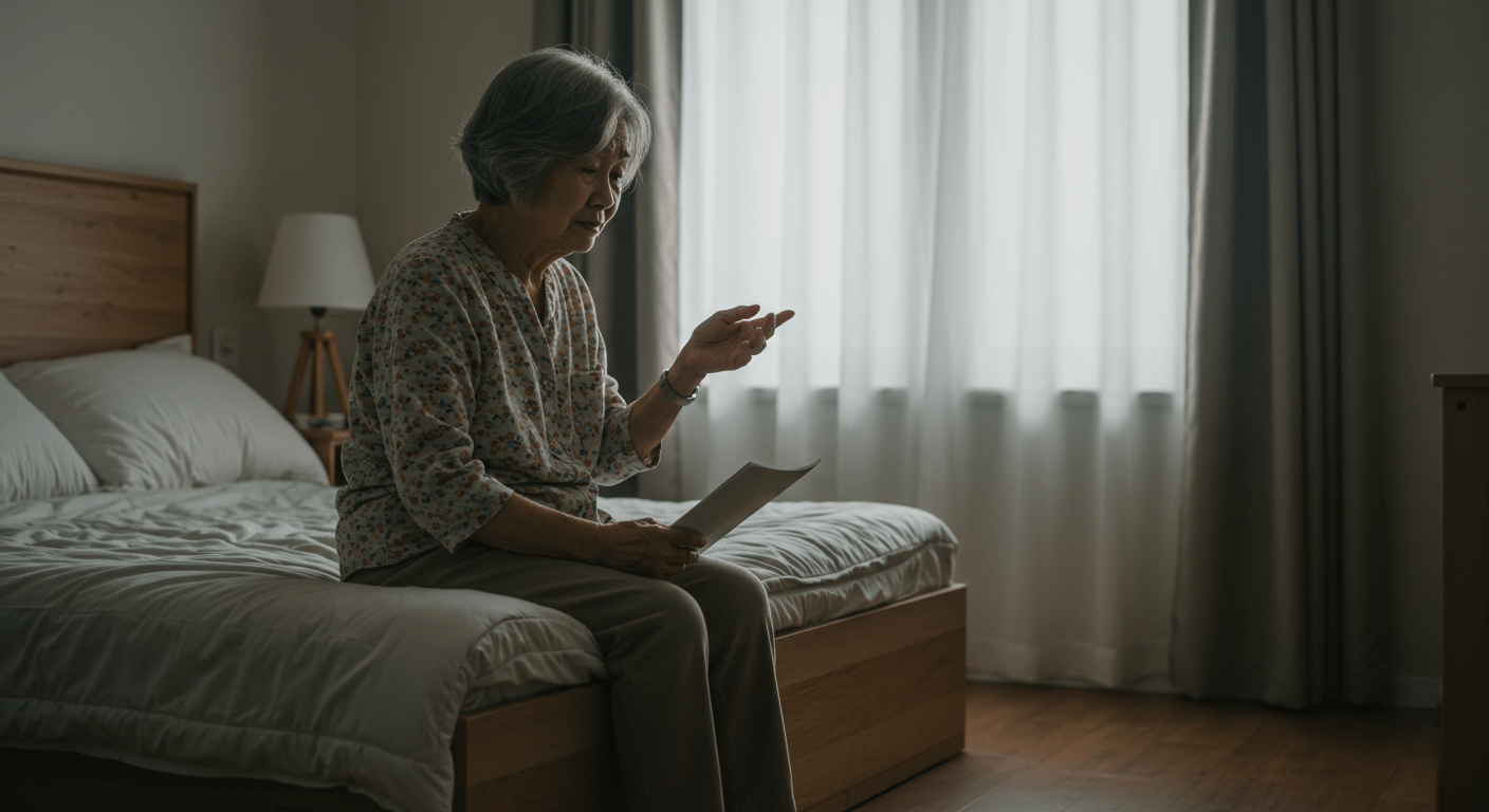 기억을 더듬는 듯한 표정으로 침대에 앉아 있는 노년 여성