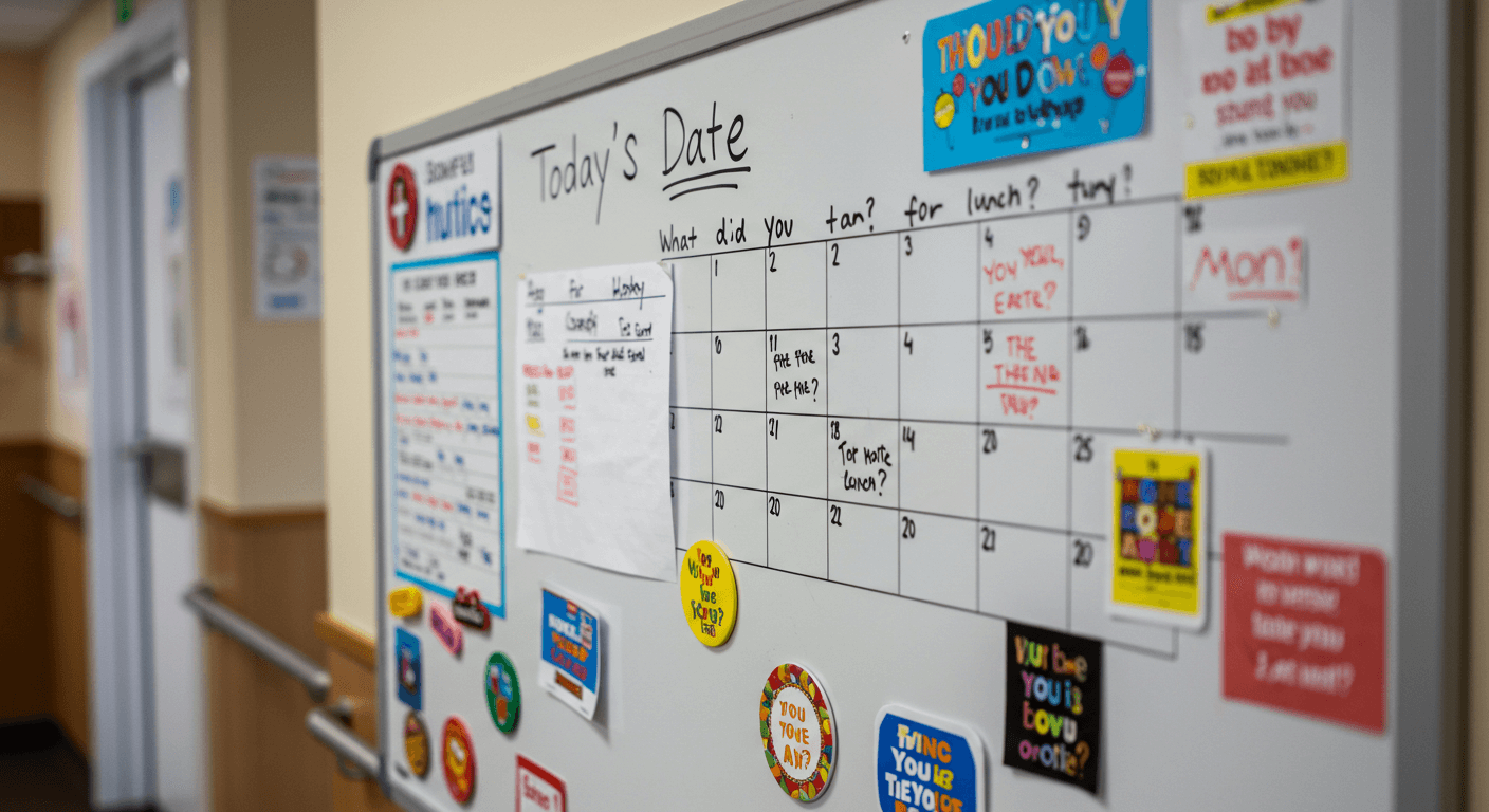 오늘 날짜와 간단한 질문이 적힌 요양시설용 인지훈련 화이트보드