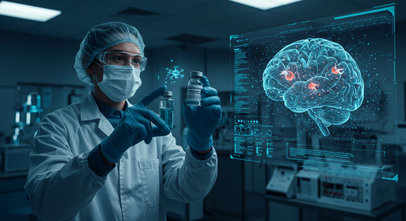 미래 첨단 연구실에서 새로운 치매 치료제를 개발하는 과학자의 모습